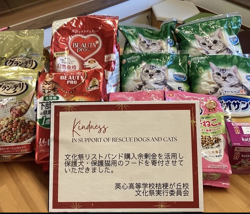 遅くなってしまいましたが、文化祭実行委員会のリストバンド企画において、購入余剰金を活用して保護犬猫用フードや猫砂を寄付してきました。