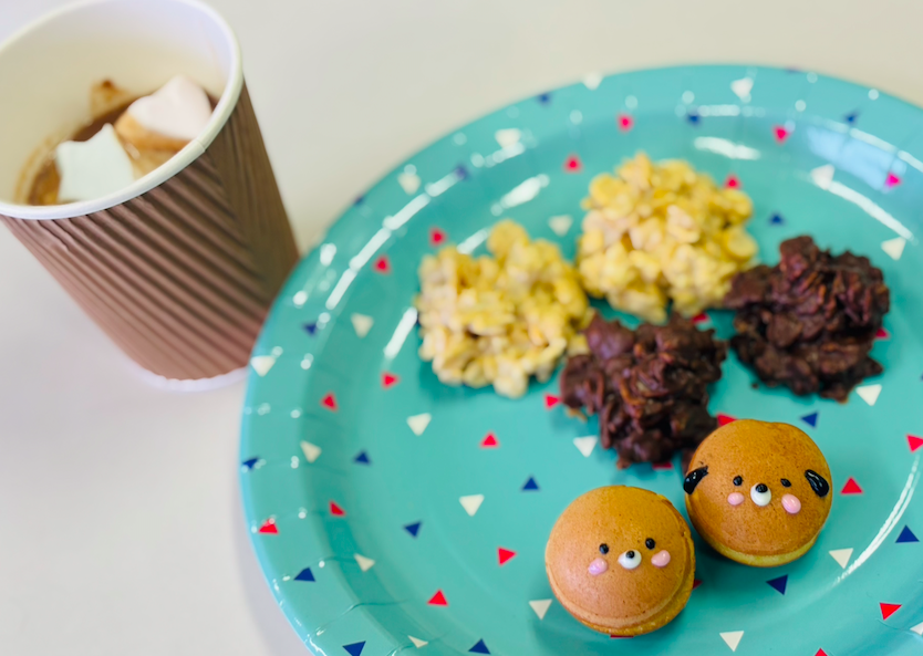 わきあいあいと楽しむことができました。ホットチョコレートにはかわいいマシュマロをのせて完成!